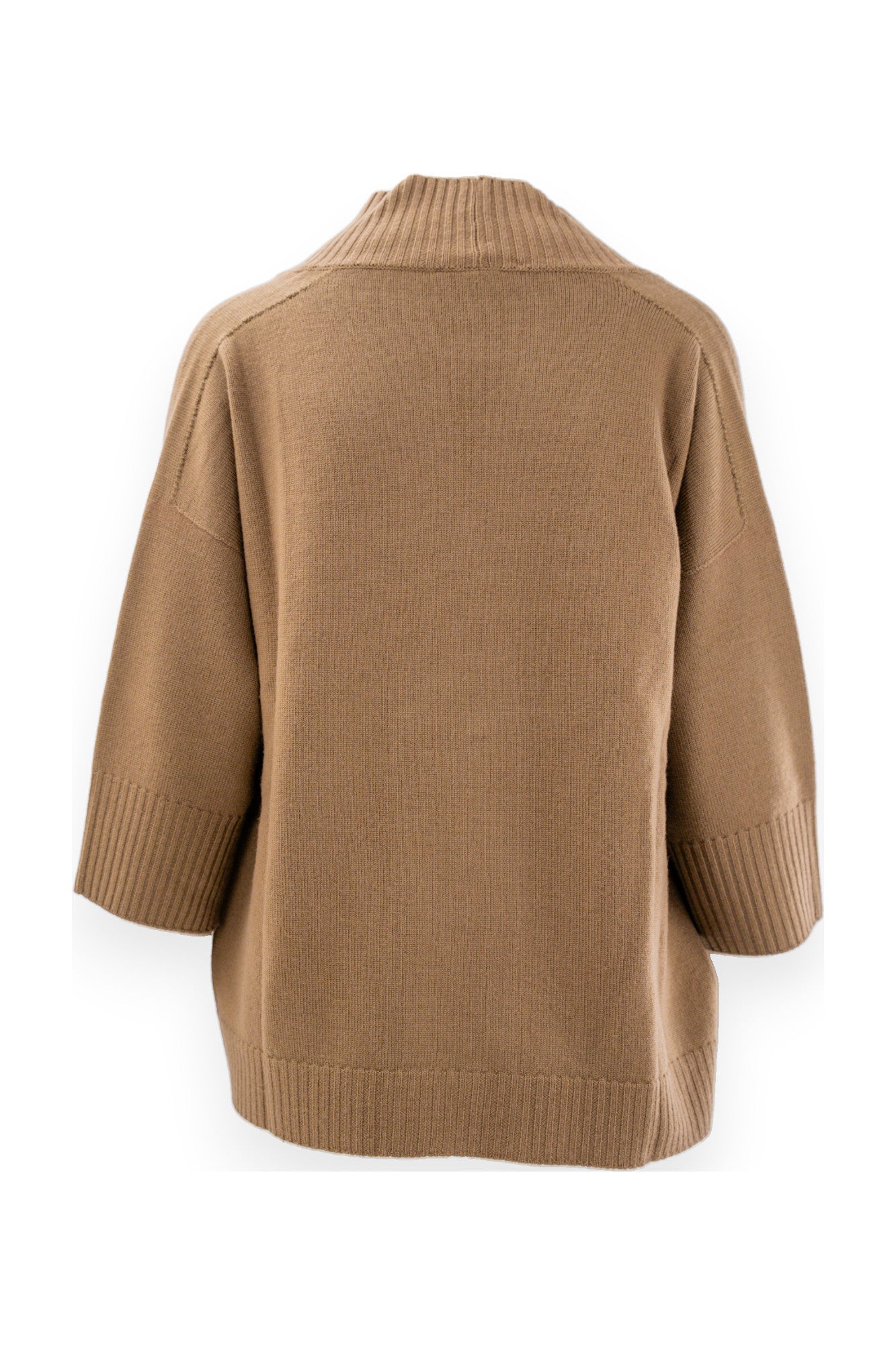 Cardigan ampio realizzato in pregiata lana pura. La struttura senza cuciture avvolge la figura in un comfort sofisticato, mentre la manica kimono a 3/4 e la lista ampia a coste donano carattere e movimento al capo. Perfetto per aggiungere un tocco ricercato ai look di tutti i giorni.