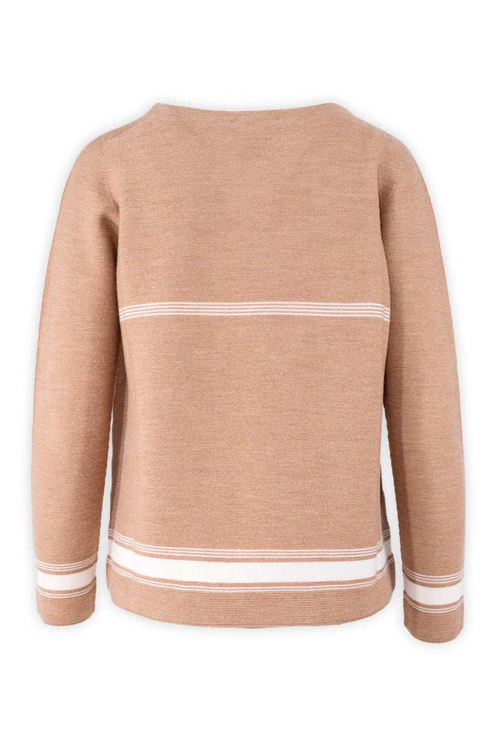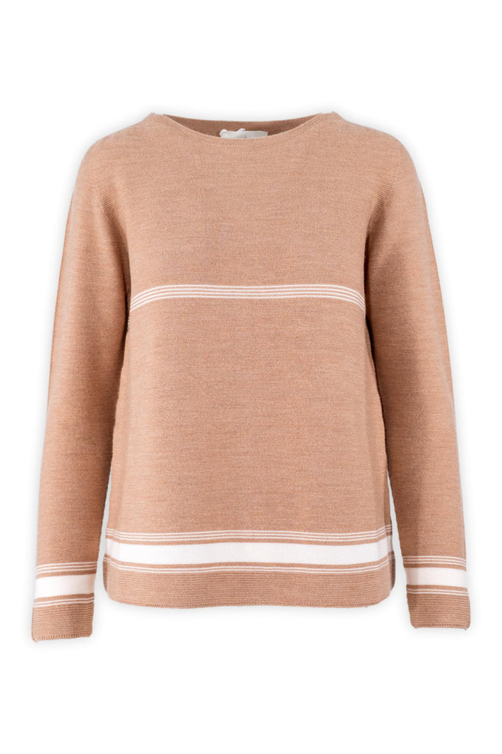 Crewneck sweater made of pure wool, crafted as a complete garment with elegant contrasting color stripes. Features set-in sleeves and a straight cut with a regular fit. A refined and practical piece for everyday wear. Available in various sizes and colors.