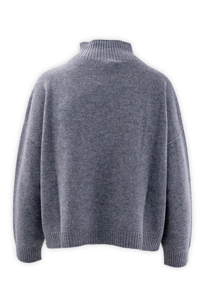 A 90% wool, 10% cashmere two-ply funnel-neck sweater. It features a full-length, chain-stitched drop shoulder, and ribbed cuffs and hem. An original piece with unparalleled sophistication and softness. Relaxed fit.