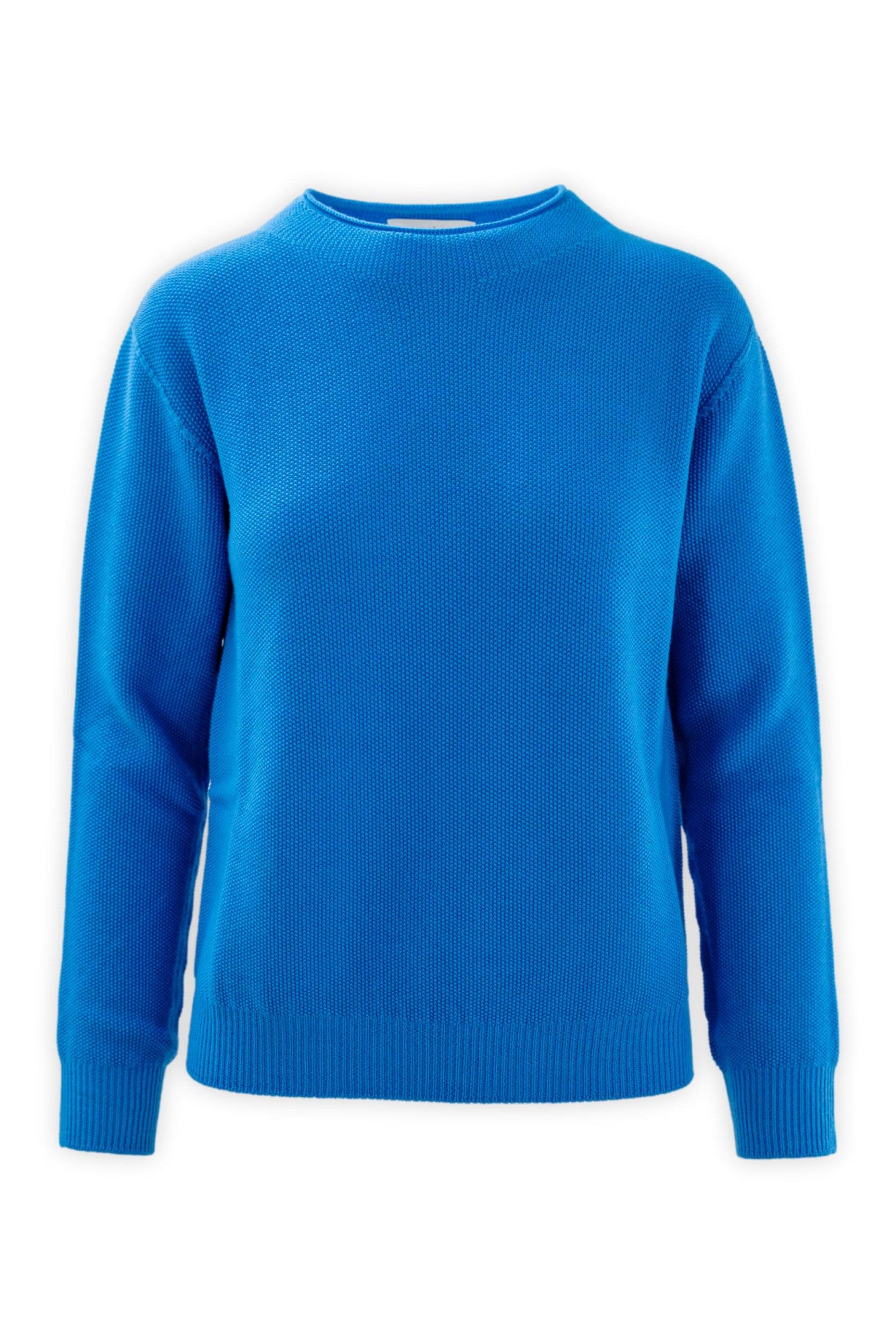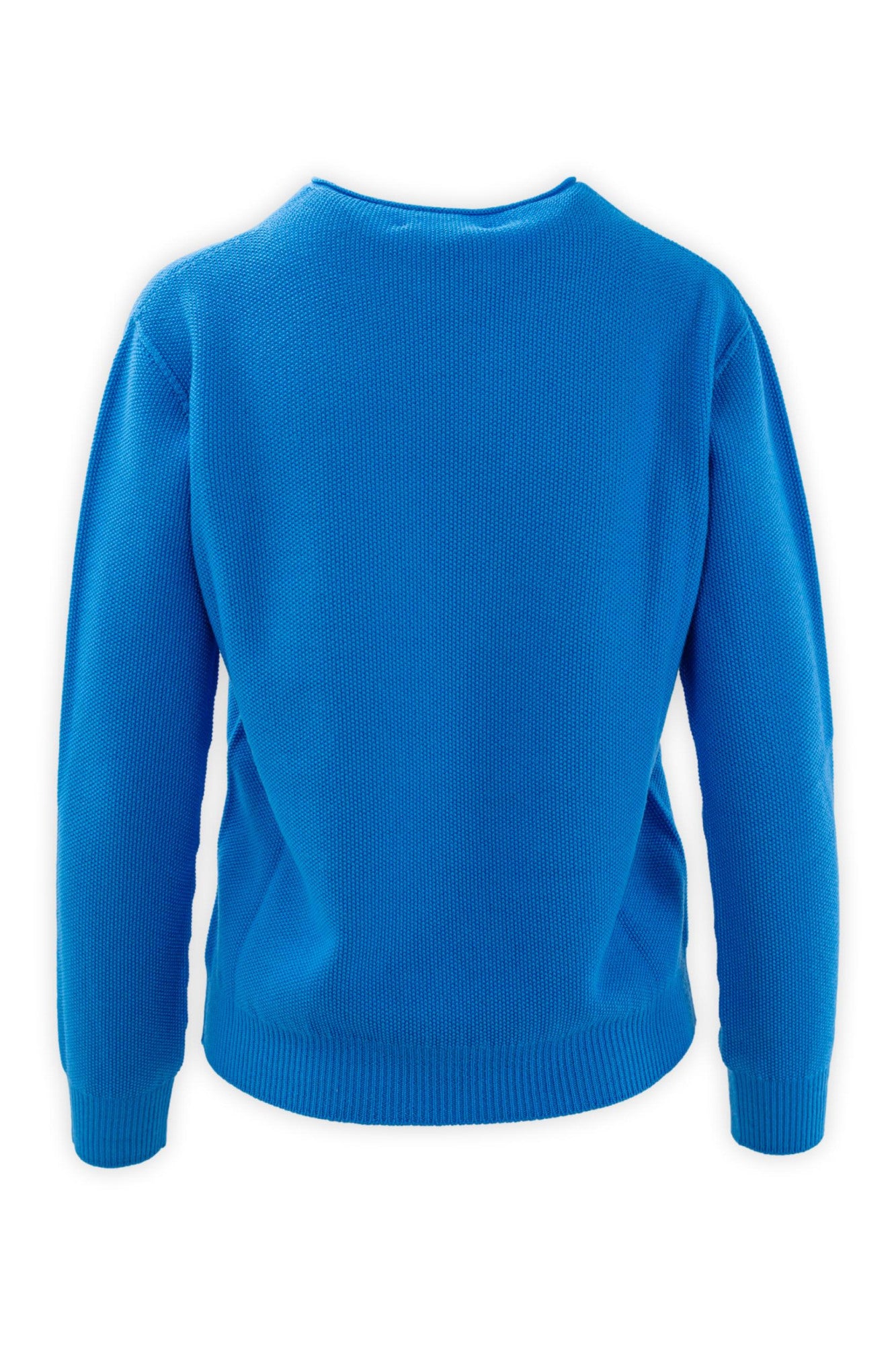 Clean lines and a compact texture define this essential sweater. The micro-grain moss stitch gives it a modern look and a soft hand, while the ribbed edges enhance the silhouette with a subtle graphic touch.