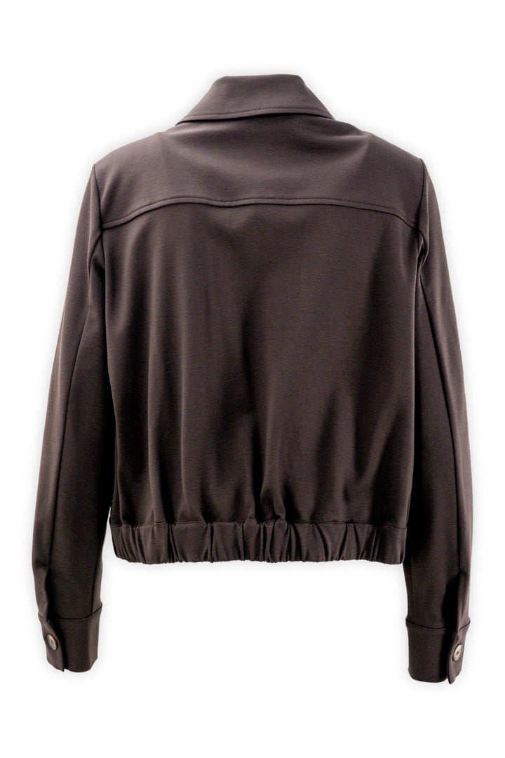 Giubbino con zip e collo sportivo realizzato in texture di morbida viscosa elasticizzata. Si propone con tasche con pattine, polsini con bottoni e vestibilità regolare con varietà di taglie e colori. Un capo di classe con un tocco pratico.