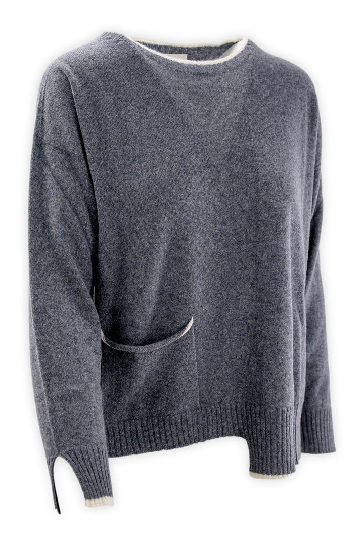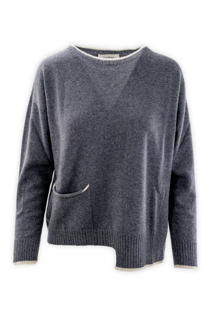 Maglia girocollo in puro cashmere con taschina e profili a contrasto