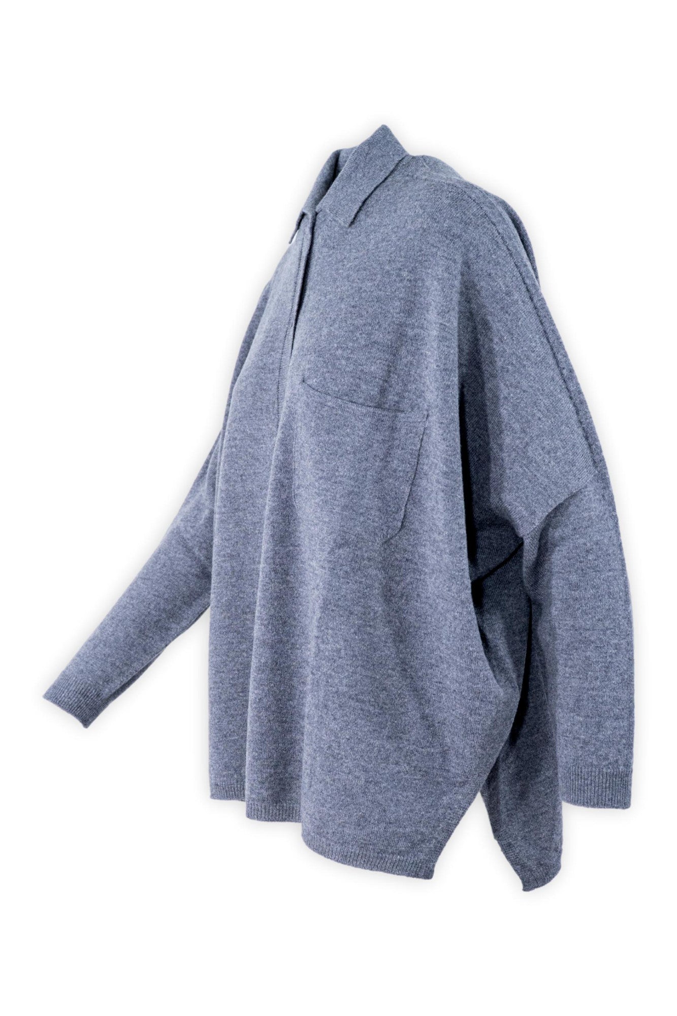 Maxi camicia in 90% lana e 10% cashmere con finezza 2 fili realizzata con collo sportivo. Presenta linea ad ovetto a capo completo con manica a 3/4, spalla scesa con taschino, lista operata in links e spalla operata. Ampia la vestibilità con parte più lunga posteriormente con spacchi laterali.